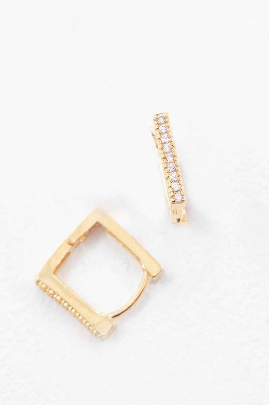 Gold and stone studded small squared hoop earrings.* Brass* 18k Gold PlatingMeasurements:* 0.44 in 1.11 cm