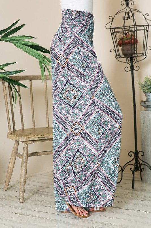 Bohemian, tribal woven print, wide leg pants. Elastic smoked waist with side pockets.Model wearing Blue combo is 5'9, wearing size SmallModel wearing Multi combo is 5'7 wearing size Small
