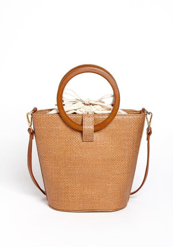 - Straw bucket bag- Wood round top handle - Tote bag - Bohemian style bag- Summer beach bag- Vacation bag- Fashion bag- Convenient and durable - Suitable for all occasions- One size- Approximate measurements: 9\" H X 10\"L X 4\"W