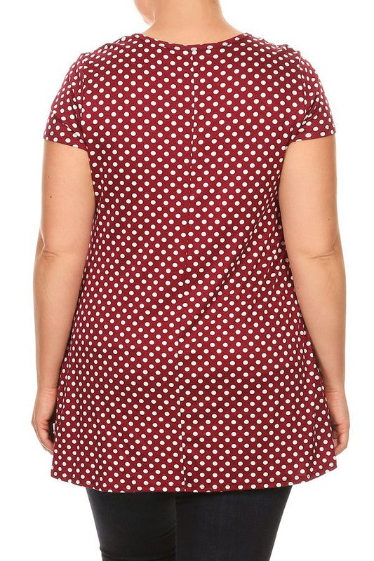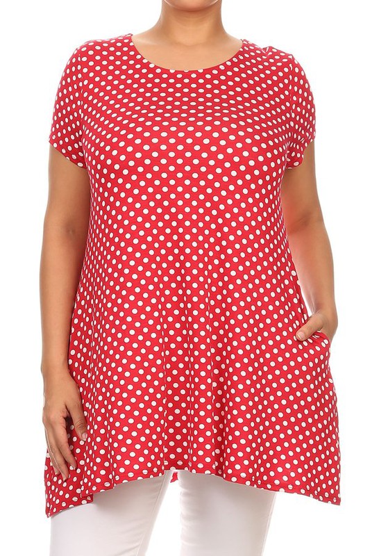 Polka dot print, waist length short sleeve top in a relaxed style with a crew neck and side pocket detailing