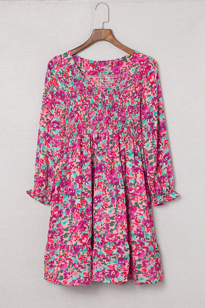 Floral Smocked V-Neck Flounce Sleeve Dress