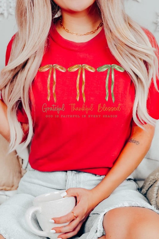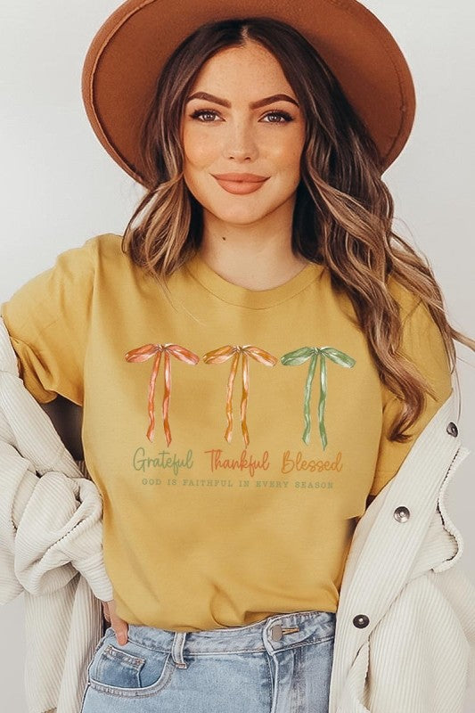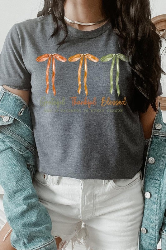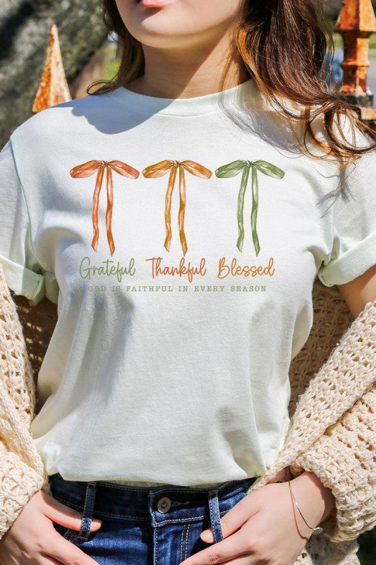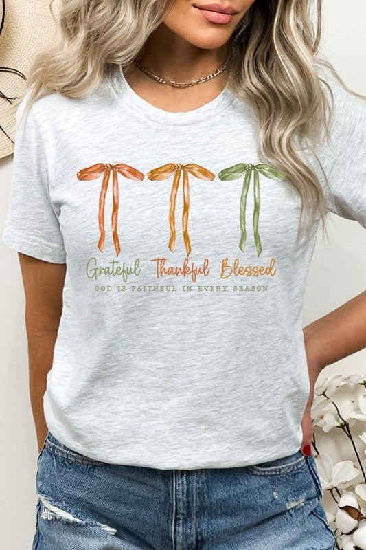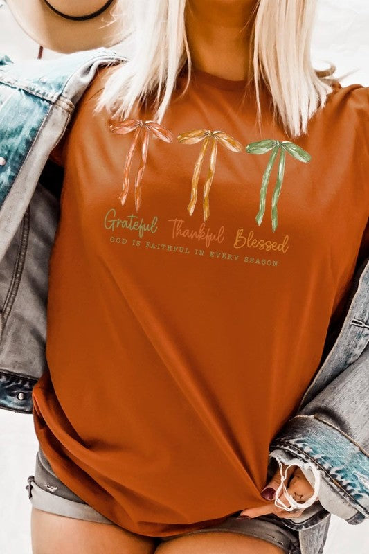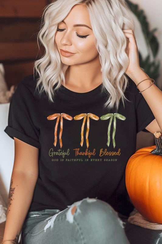 Grateful Thankful Blessed, Coquette Fall Season, Faith Based Autumn Sublimation, Christian Fall Bow Png, Coquette Religious Fall Graphic Tee.