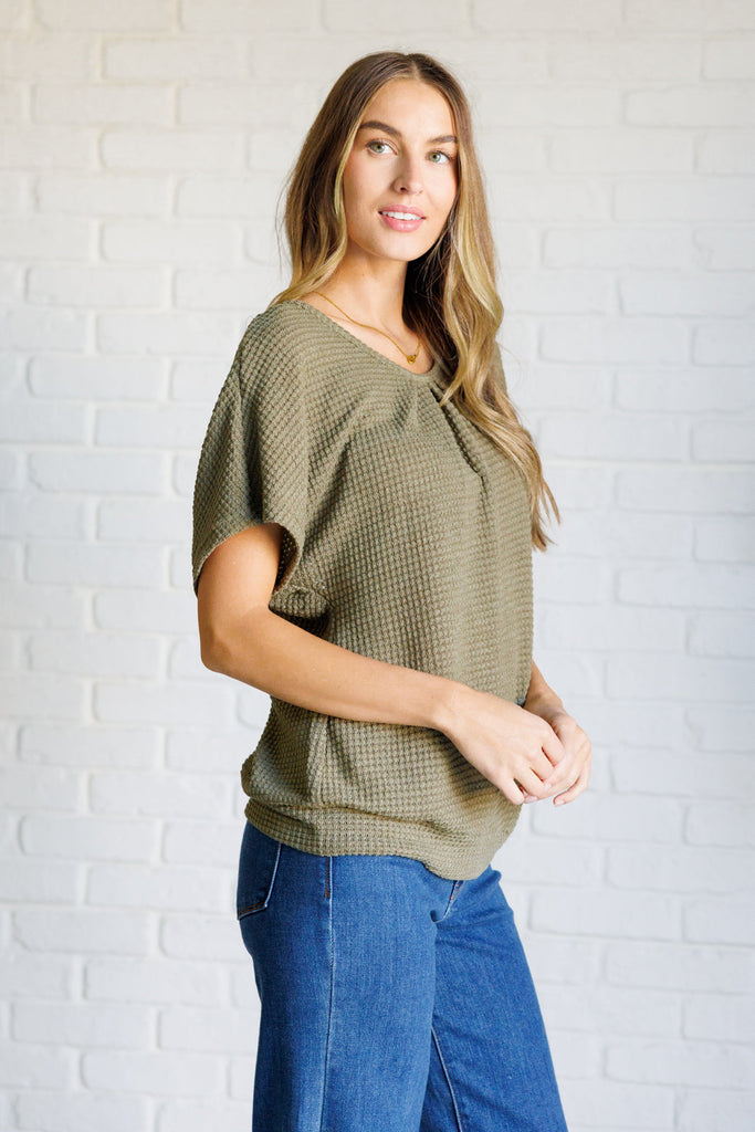 Unleash your playful side with our Secret Detail Lace Back Top! Made from waffle knit fabric with high stretch for ultimate comfort. The scoop neckline and dolman sleeves add a touch of chicness, while the sheer back lace panel adds fun and unexpected bit of mystery. (Pssst...it also has a banded hemline for a flattering fit!)